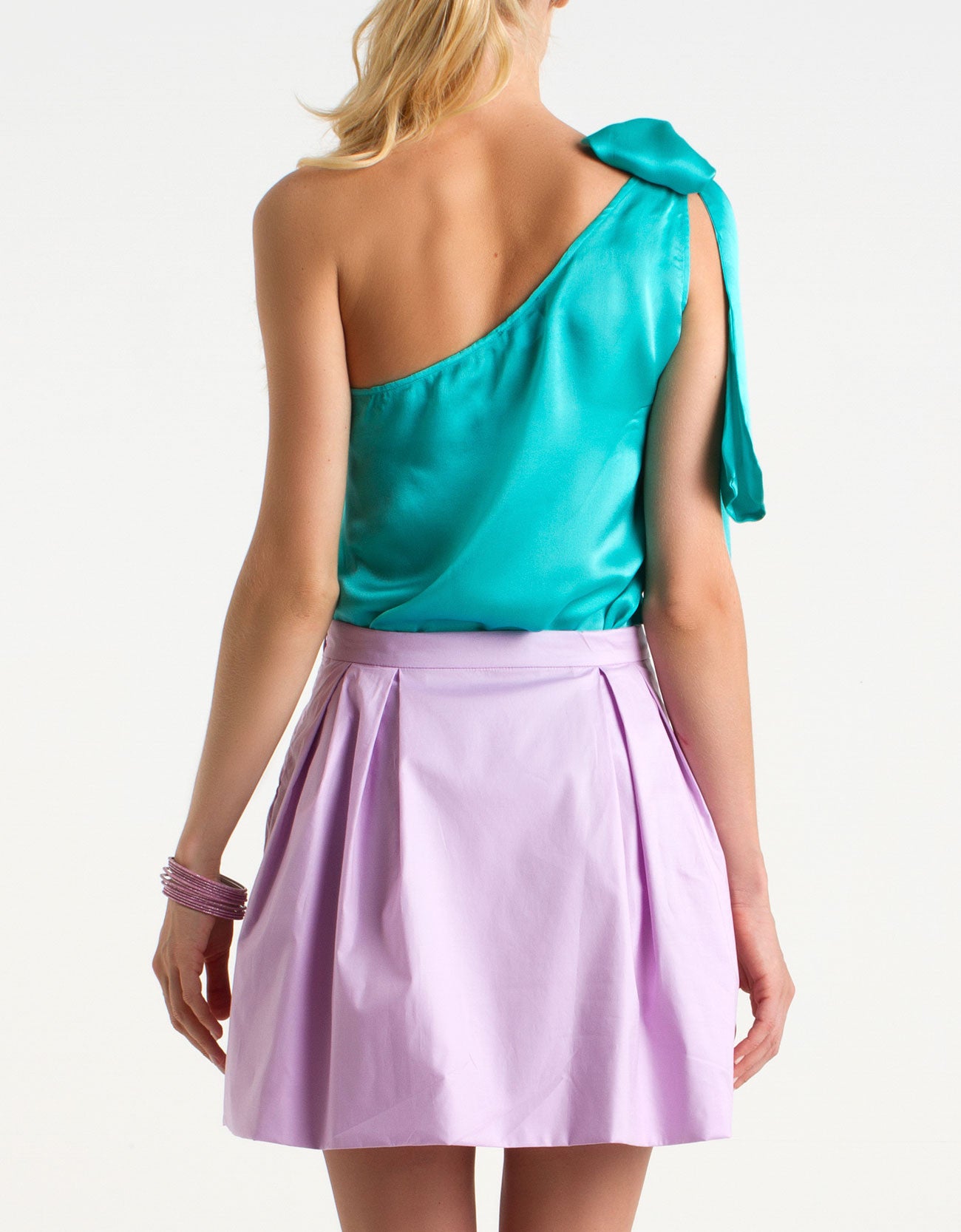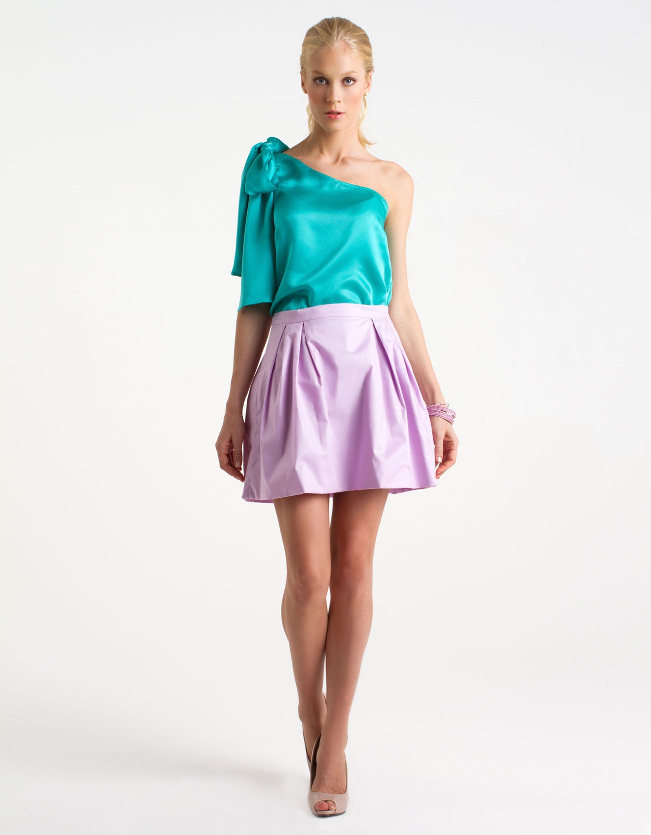 Mini skirt featuring a high waist with a wide band, pleats to the hips for a bell shape.