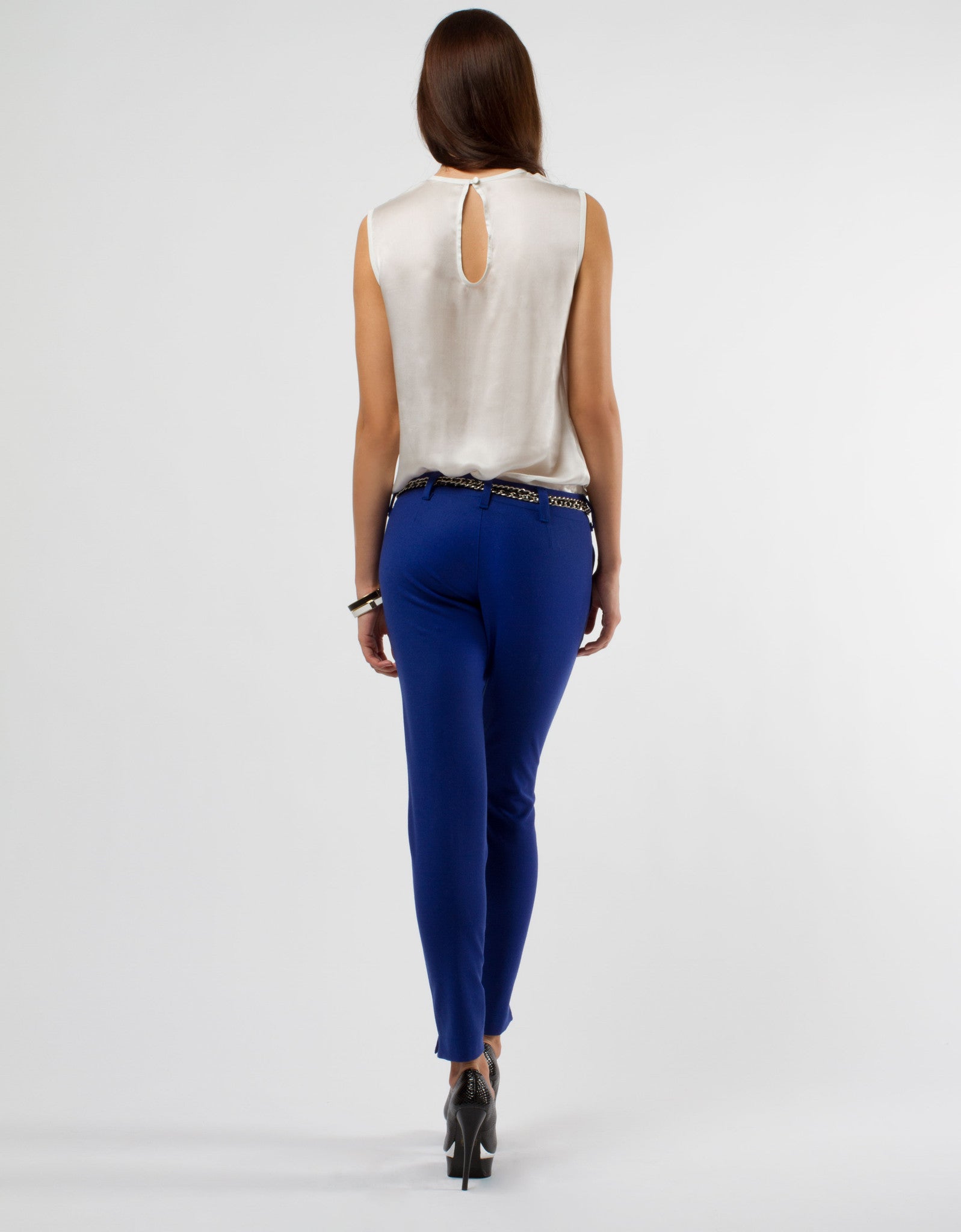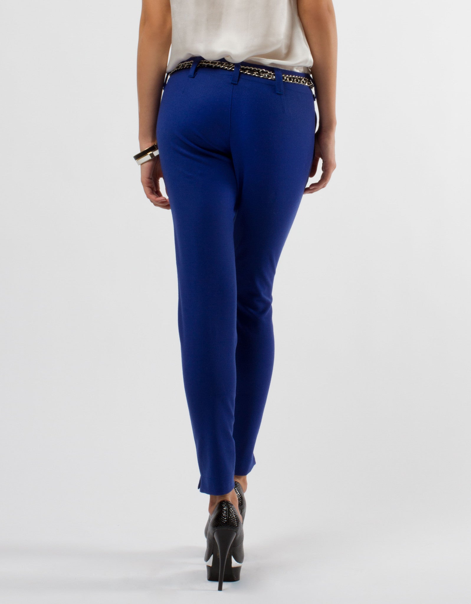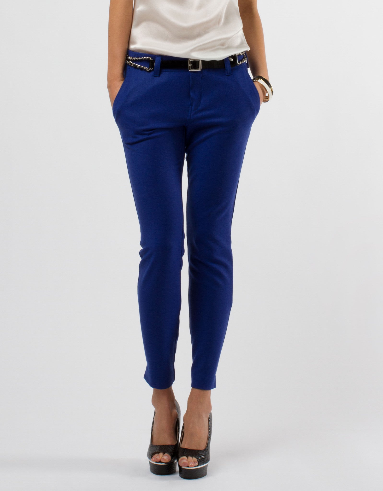 Tight blue pants with pockets and belt loop