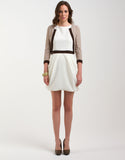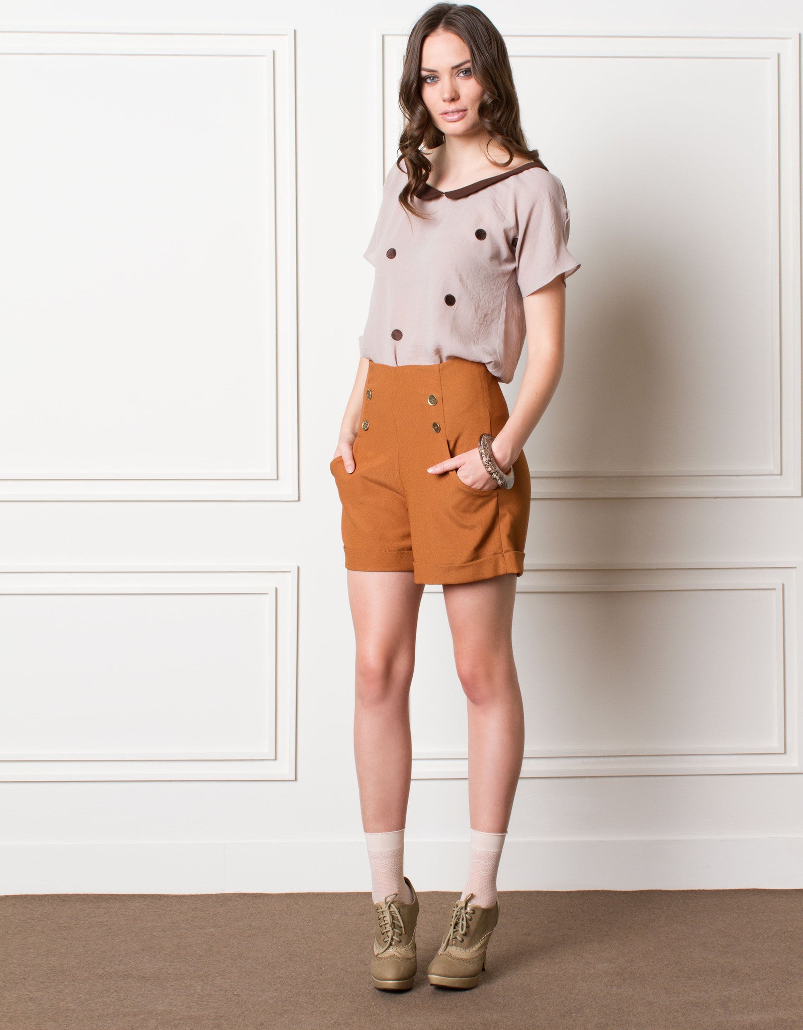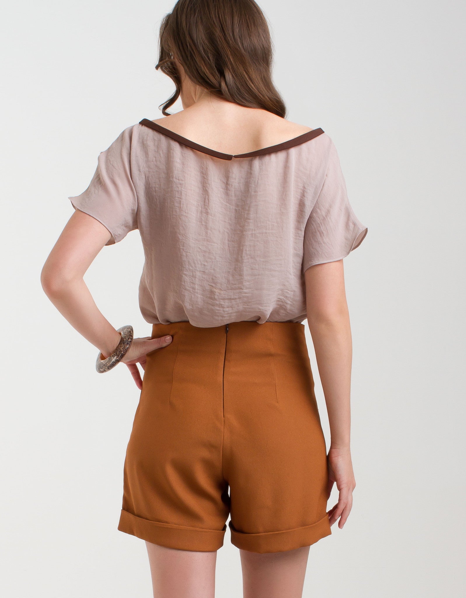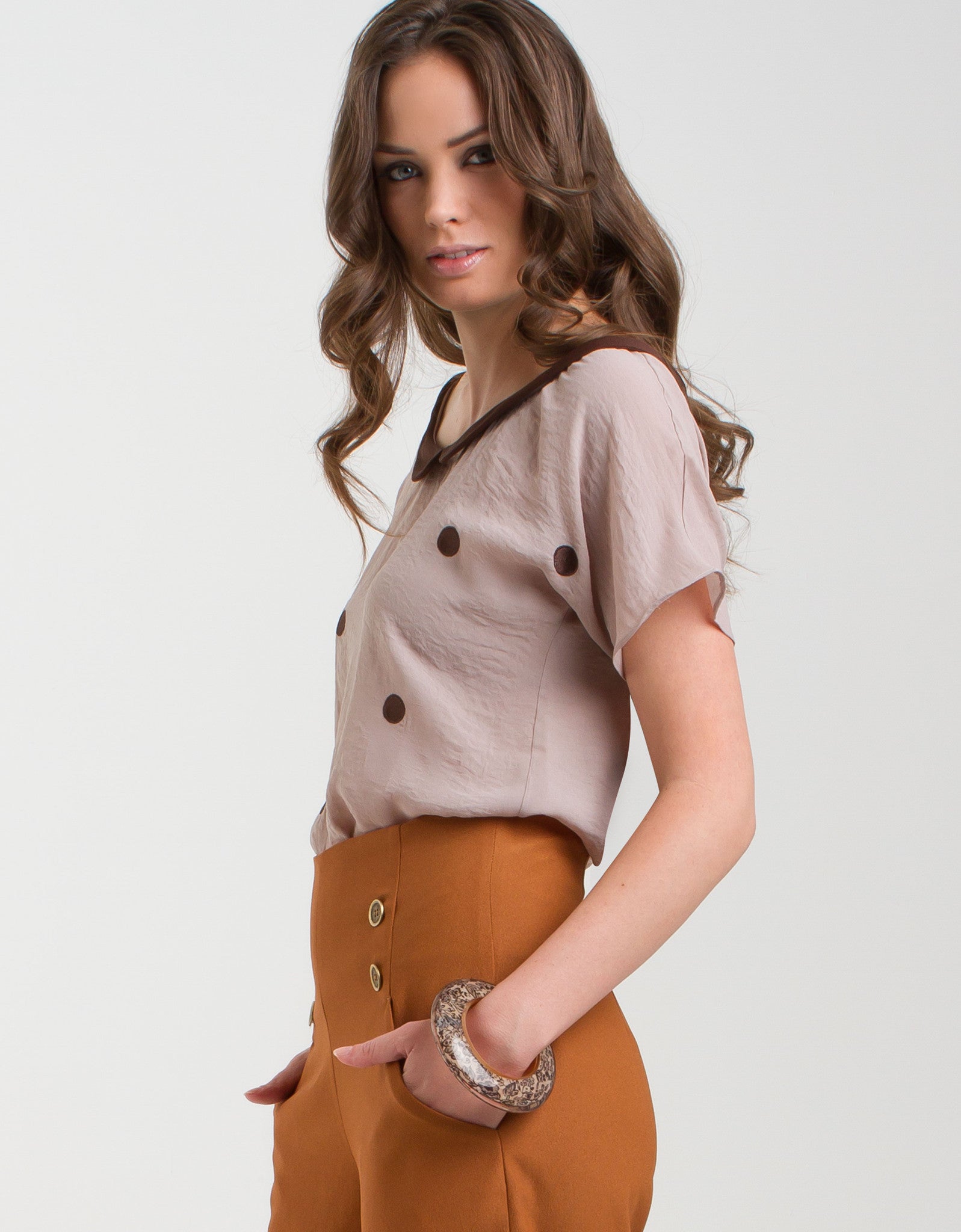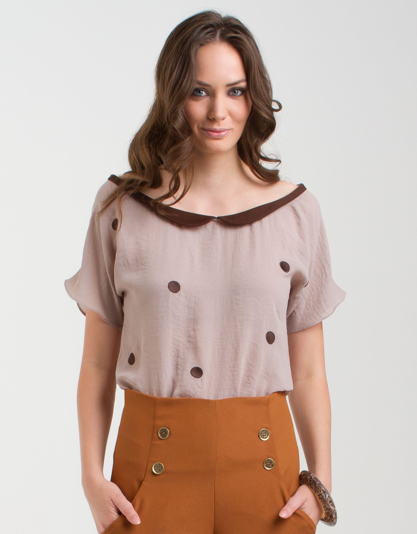 Beje collared blouse with wide-neck, short-sleeved, dots of a darker tone on the front.